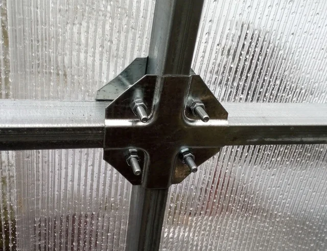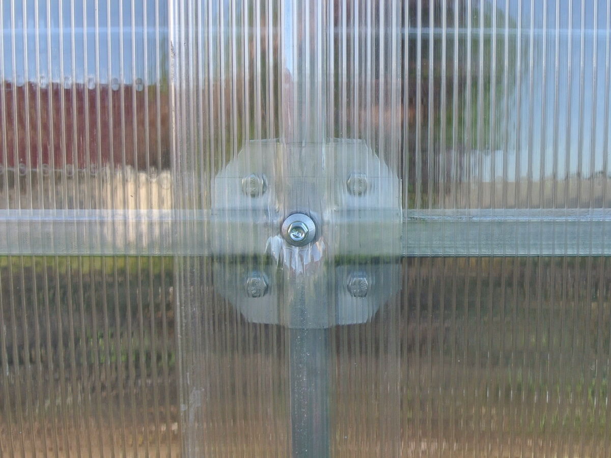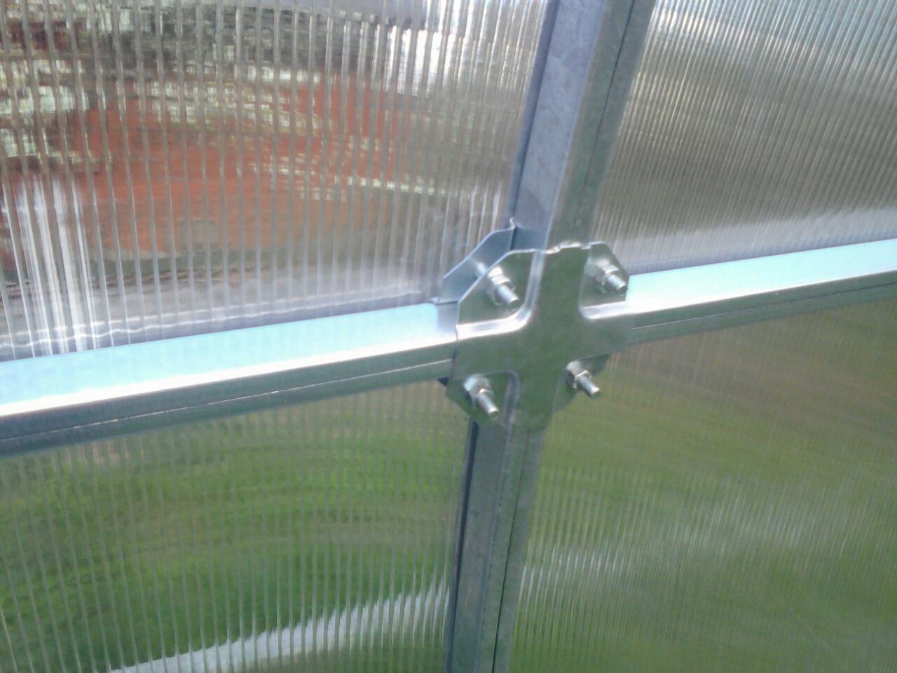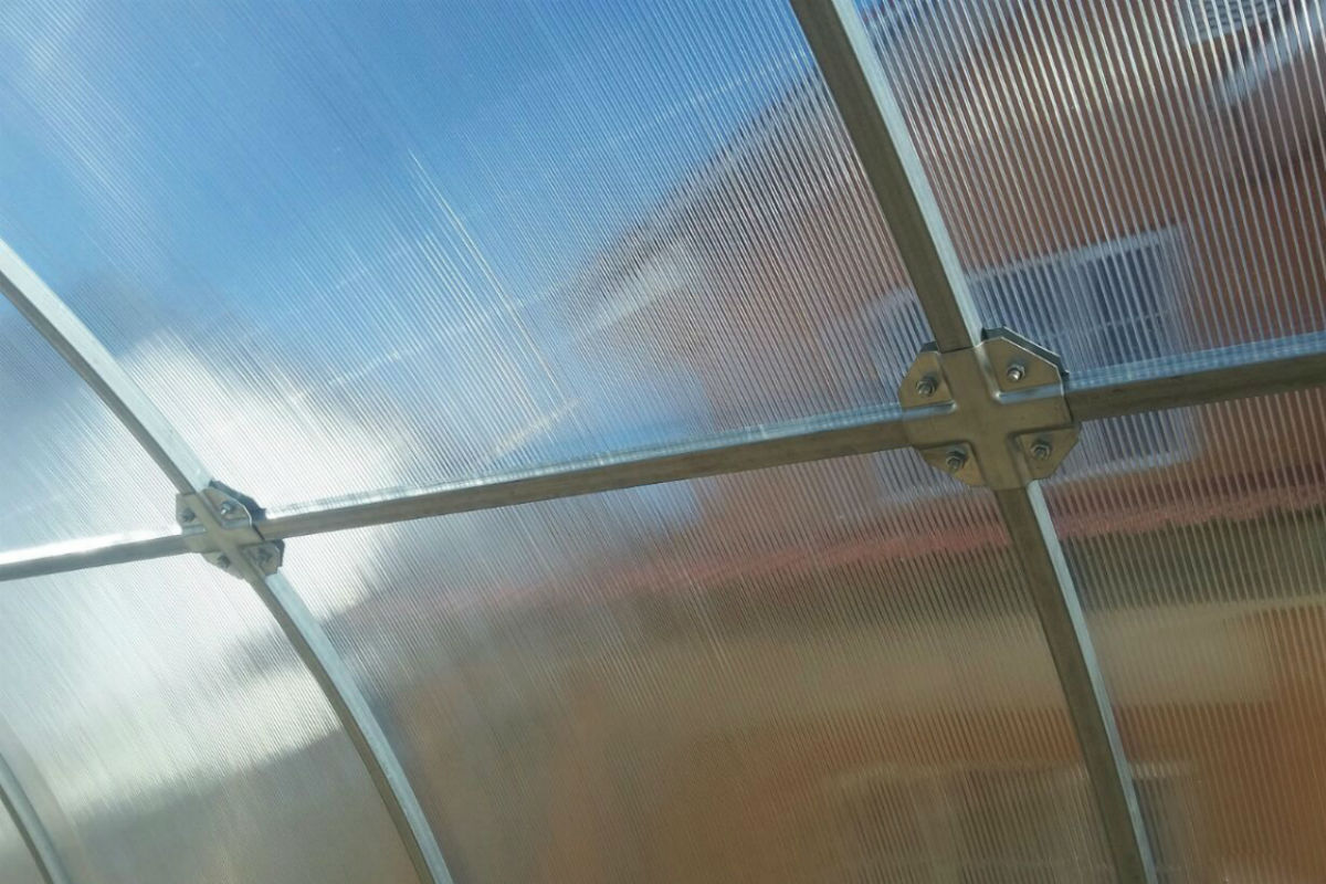«Краб-система» позволяет находиться горизонтальному соединению в плоскости дуги, то есть сотовый поликарбонат прилегает не только к дугам, но и к горизонтальным стяжкам. Такая конструкция каркаса максимально снимает нагрузку с поликарбоната, перенося ее непосредственно на прочный каркас.